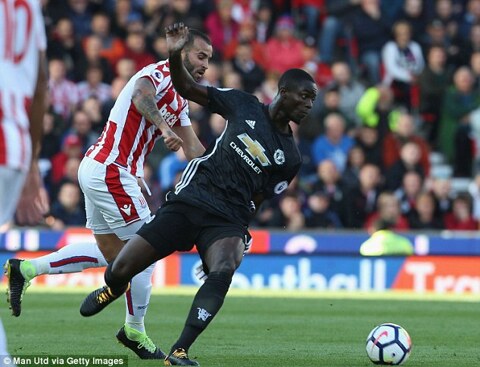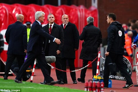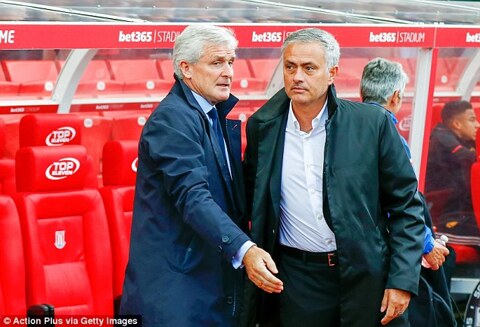 Mourinho may still be stewing after refusing to shake the hand of Mark Hughes after the 2-2 draw at Stoke. Hughes pushed the United boss and told him to 'f*** off' when he encroached on his technical area. Mourinho bemoaned Stoke's physicality but Hughes gave that short shrift.
